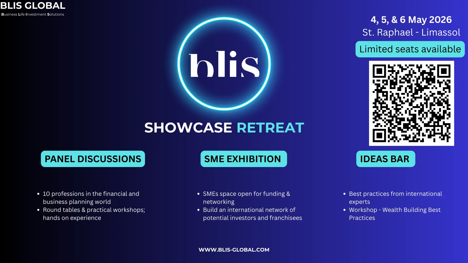 BLIS GLOBAL Solutions is organizing its Showcase Retreat by the sea at St. Raphael Limassol where C-Level executive, senior experts and decision makers will learn from international experts, SMEs will exhibit to investors and franchisees, and best practices will be shared through panel discussions and the ideas bar. What to expect: