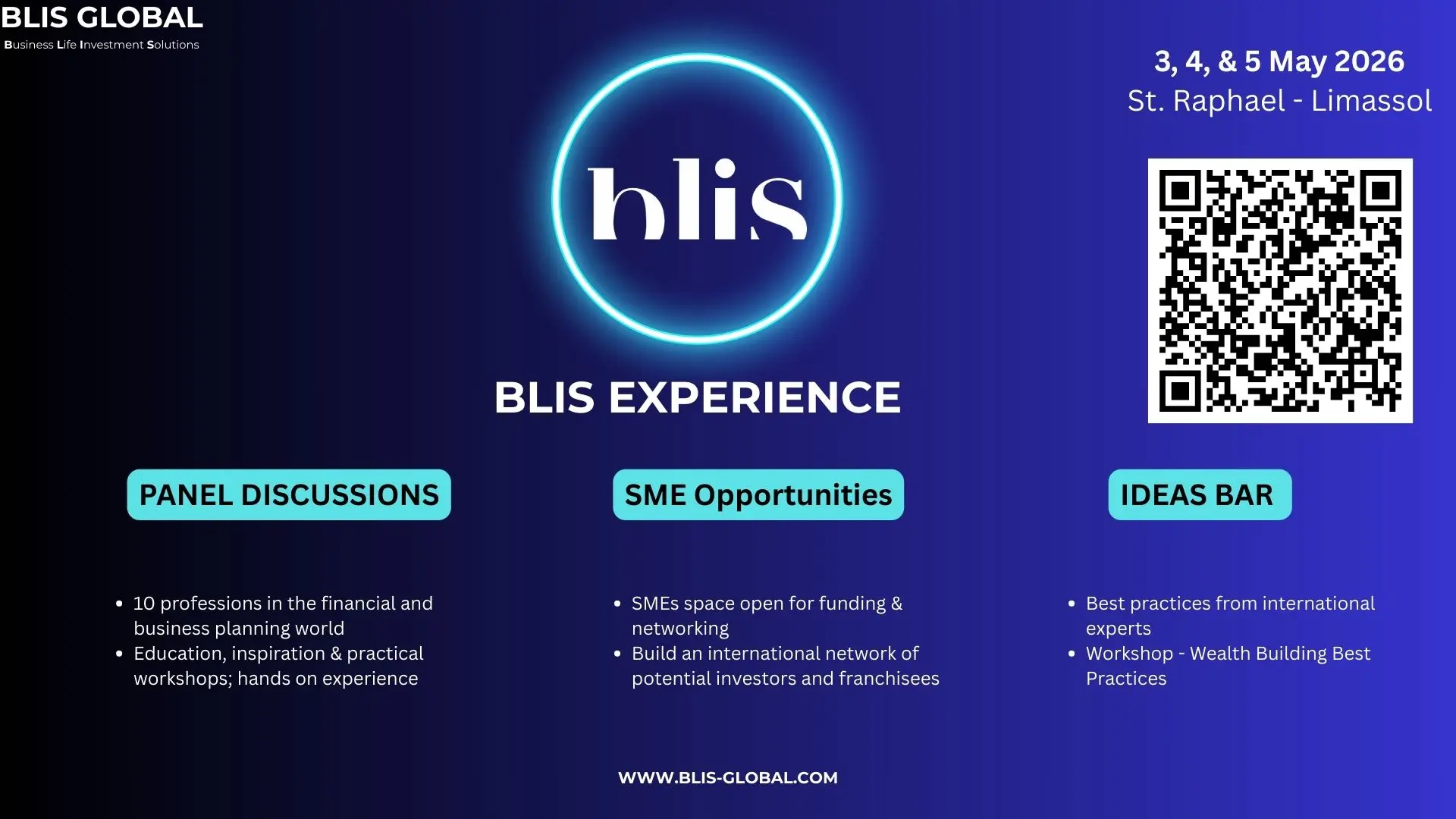 BLIS GLOBAL Solutions is organizing its next Experience by the sea at St. Raphael Limassol where professionals, executives, senior experts and decision makers will learn from international experts, SMEs will exhibit to investors and franchisees, and best practices will be shared through panel discussions and the ideas bar. What to expect: